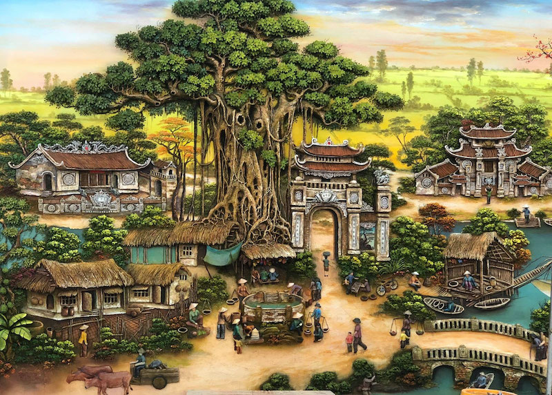 4. Chỉnh sửa và hoàn thiện: Sau khi các chi tiết được đắp nổi, nghệ nhân sẽ tiến hành chỉnh sửa, làm mịn và sơn màu để hoàn thiện bức tranh.