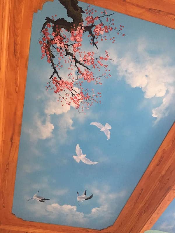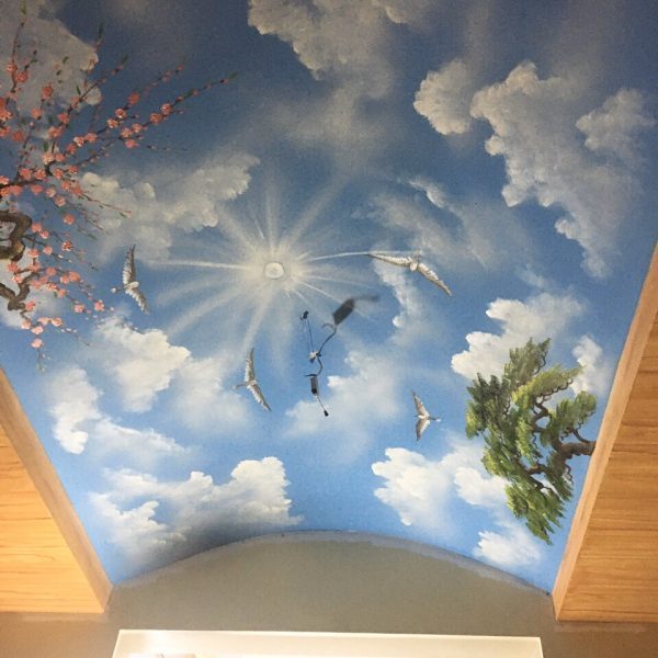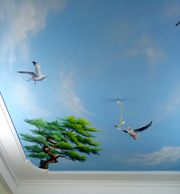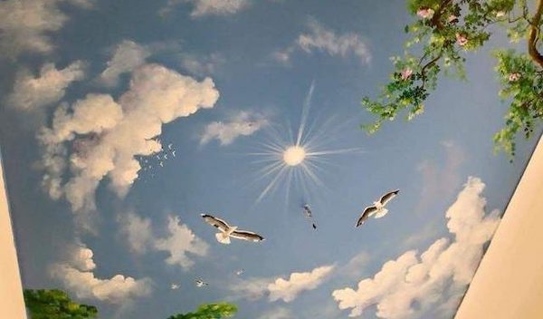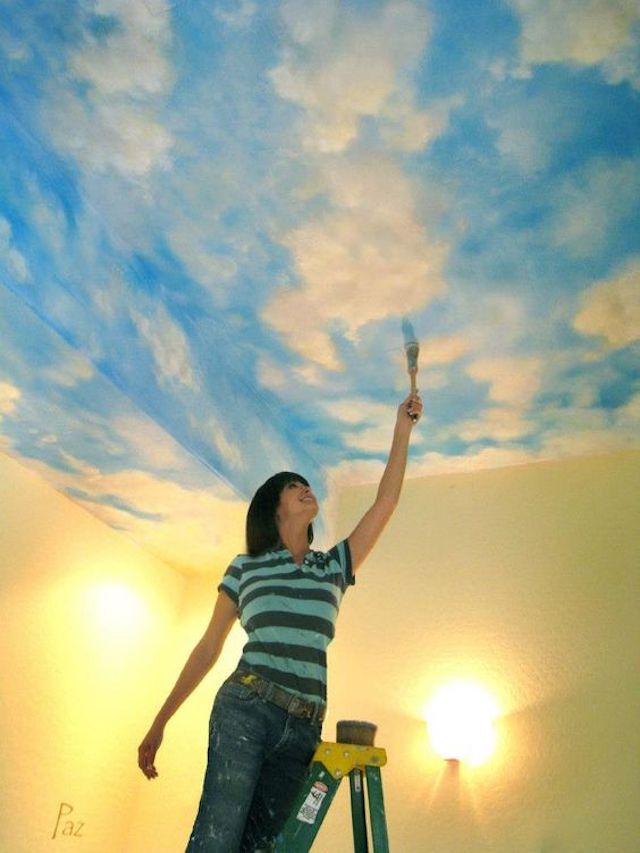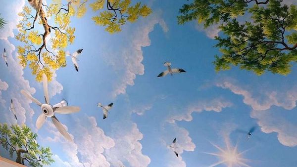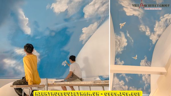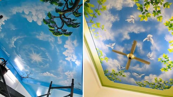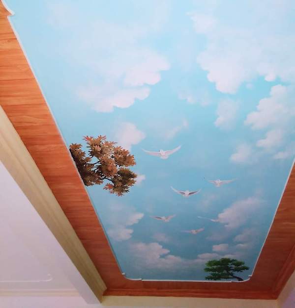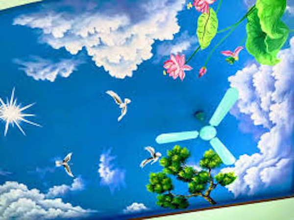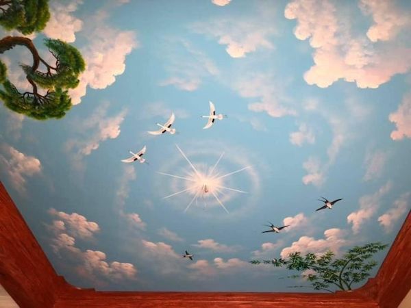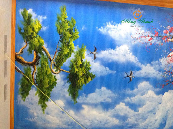 Vẽ trần mây là một hình thức vẽ tranh tường nghệ thuật ở một trình độ cao hơn, tranh sẽ được họa sĩ vẽ trực tiếp lên trần nhà với những nội dung chính là áng mây, ánh nắng hoặc là một bầu trời đêm đầy trăng sao. Những bức vẽ trần mây 3D đẹp mắt sẽ mang đến một cái nhìn khác lạ về hình thức trang trí không gian đầy nghệ thuật vẽ tranh tường. Từ trần nhà trống trơn sẽ biến thành một tác phẩm nghệ thuật đầy thu hút với nhiều màu sắc sinh động, đa dạng, tạo nên một cảm giác sang trọng và làm không gian trông có vẻ rộng rãi hơn.